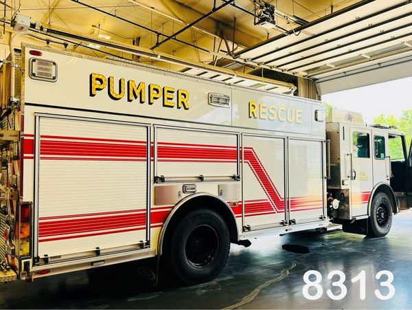 8313 is a 2010 Pierce Velocity Pumper/Tanker. It has a 1000-gallon tank and is capable of pumping 1500 gallons per minute. It also carries AFFF (aqueous film-forming foam). 8313 is the second out pumper for House 1.